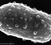 Outer Membrane Vesicle (OMV) Secretion During Lignin Breakdown. Scanning electron microscopy image of Pseudomonas putida after 72 hours of cultivation in lignin-rich media showing OMVs blebbing from the outer membrane.